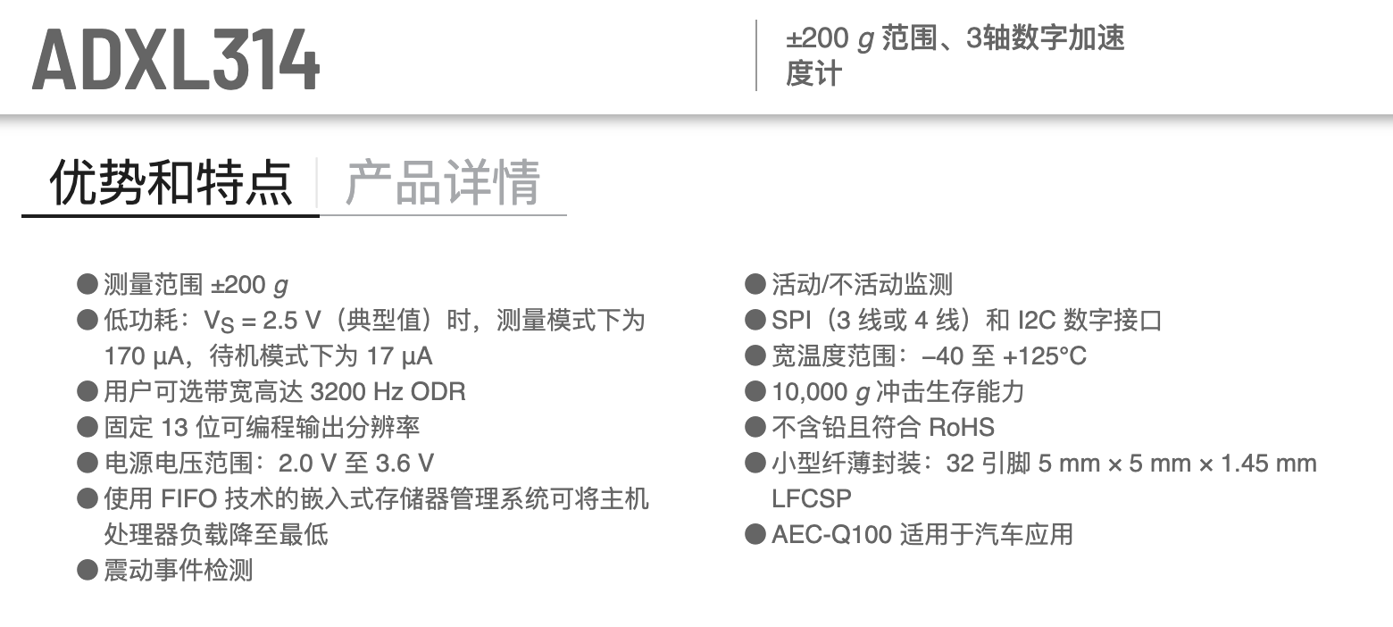 大量程车规级的 ADXL314,满足车规级 AEC-Q100 标准,温度范围拓展从– 40 ° C 到 +125 ° C,量程为 200 个 g,可以用于胎压监测、电动车电池监测、碰撞检测等场景。工信部规定,自 2022 年 1 月 1 日起,对新生产的乘用车强制安装 EDR 行车事件记录器,也就是黑匣子 。这款 ADXL314 就适合用于 EDR 中。