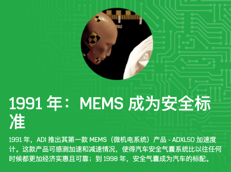 早在 1987 年,ADI 开始涉足研发生产基于微机电系统( MEMS )技术的传感器。几年后的 1991 年,ADI 发布了第一颗高 g 值 MEMS 加速度计,从此涉足汽车安全气囊碰撞监测。这就是 ADI MEMS 产品与汽车行业结缘的开始。