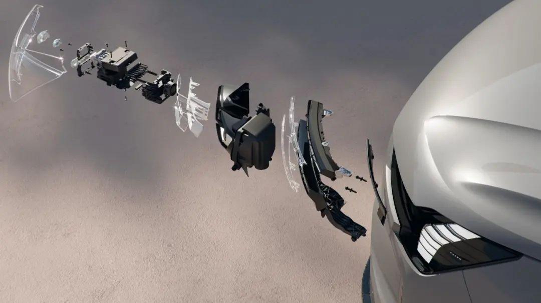 北欧人在 EX90 的大灯内部设计了一个可动结构,以不同形态清晰划分出了日间灯和照明两种状态。当车辆开启前大灯照明时,两排灯珠会各自向上下运动并熄灭,后面的远近光主灯露出并点亮,整个动作就像人眨了一下眼睛一般。
