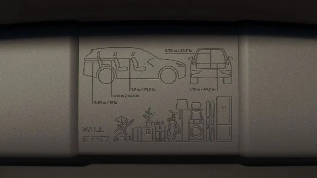 沃尔沃在 EX90 的后备箱门的上沿内侧设置了一个关于车内空间的尺寸小卡片。上面清晰标注出了从尾箱门到第三排、第二排、第一排座椅靠背的尺寸长度以及后备箱开口的垂直高度。尺寸之下,沃尔沃还刻画了例如婴儿车、行李箱、高尔夫球包、滑雪板等图例。
