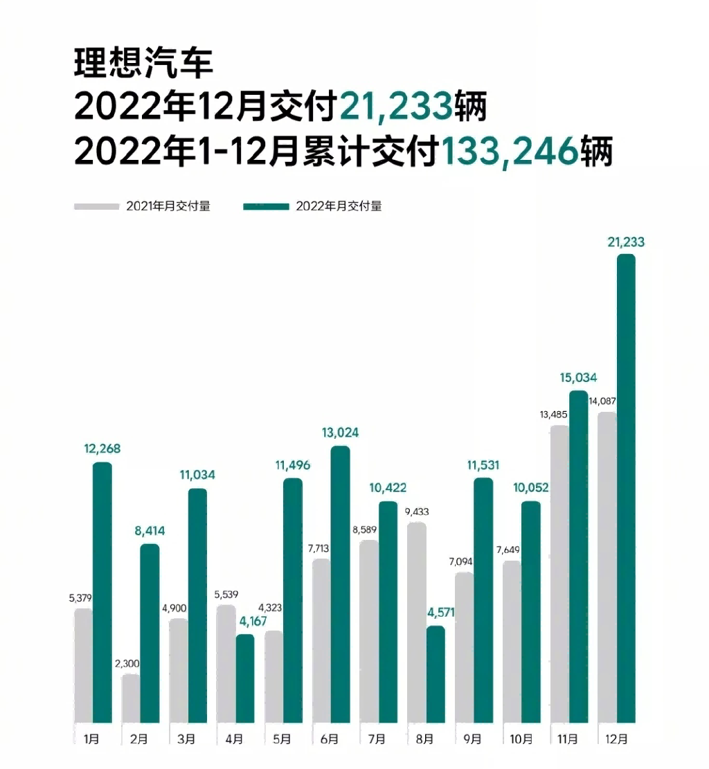 理想是今年御三家中的赢家,共交付 133,246 辆车,它的分界线同样是产品。理想在今年不光结束了单车型战略,还开启了「爆兵」模式,特别是在 L9 开启交付之后,理想势头一路向上。