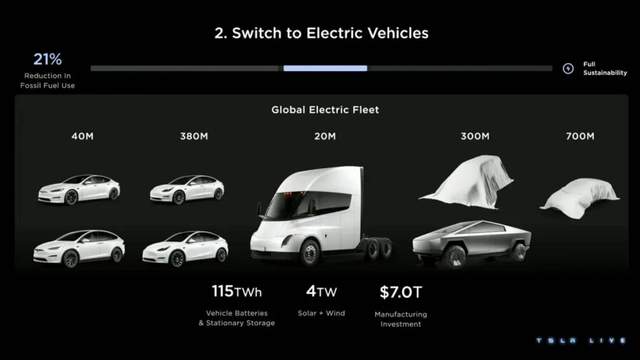 4、部署尽可能多的电动汽车,马斯克认为,特斯拉最终可能会在全球保有约 14 亿辆的车队规模。