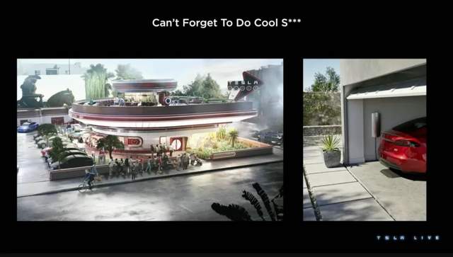 这是特斯拉构思中的充电综合体,围绕着特斯拉的超充设施,人们可以尽情进行各种娱乐活动,譬如吃饭和看电影等。
